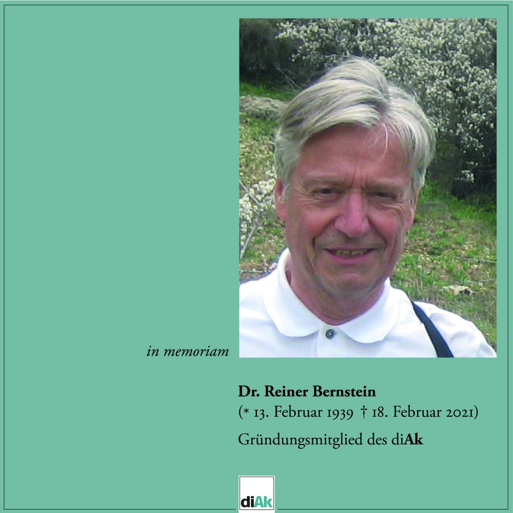 in memoriam Reiner Bernstein (1939-2021) Veröffentlicht am Februar 19, 2021Februar 19, 2021Katgeorien Uncategorized Dr. Reiner Bernstein (* 13. Februar 1938 † 18. Februar 2021)Gründungsmitglied des diAk – Ein ausführlicher Nachruf folgt. Entdecke mehr von Melde dich für ein Abonnement an, um die neuesten Beiträge per E-Mail zu erhalten. Gib deine E-Mail-Adresse ein ... Abonnieren Teilen mit: Klicken, um auf WhatsApp zu teilen (Wird in neuem Fenster geöffnet) WhatsApp Klick, um auf Pinterest zu teilen (Wird in neuem Fenster geöffnet) Pinterest Klicken, um auf Telegram zu teilen (Wird in neuem Fenster geöffnet) Telegram Klick, um auf Facebook zu teilen (Wird in neuem Fenster geöffnet) Facebook Gefällt mir Wird geladen …