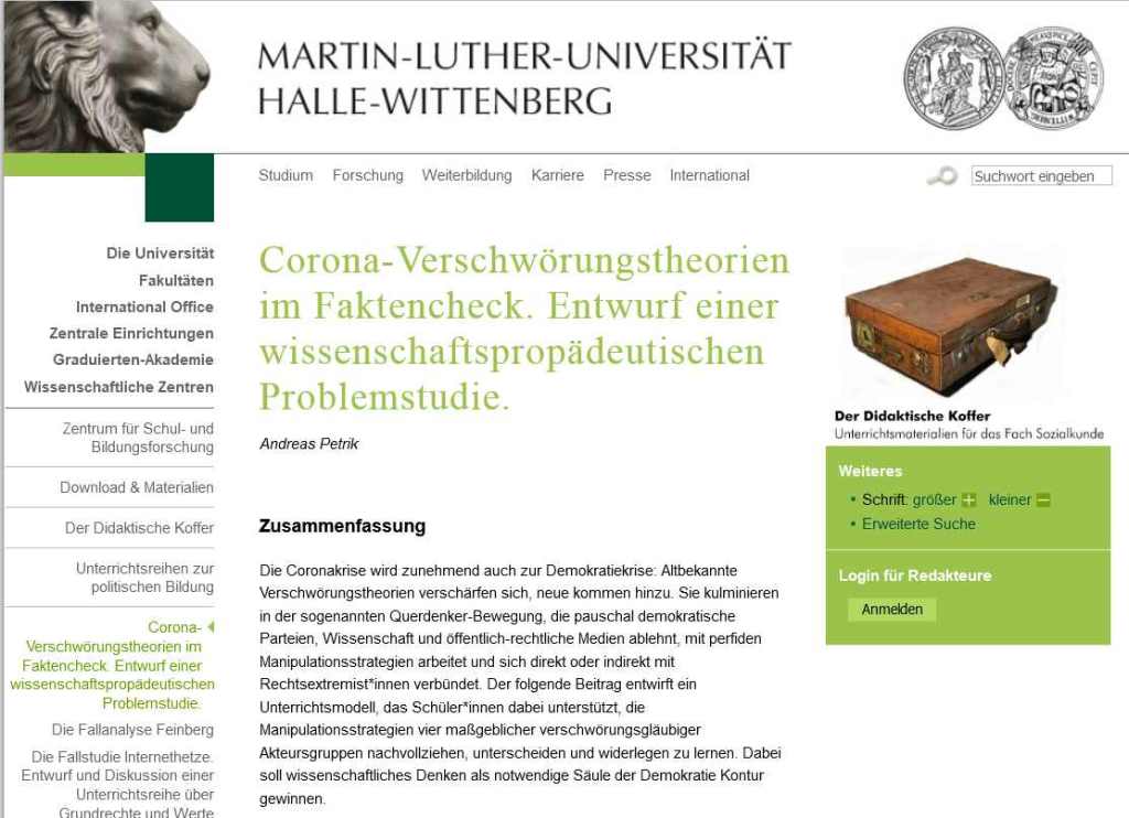 „Der Verschwörungsglaube erschüttert die Grundfesten unserer Demokratie. Im schlimmsten Fall führt dies nicht nur zur Politikverdrossenheit und Wissenschaftsfeindlichkeit, sondern zu Gewalt, wie wir beispielsweise bei den Querdenken-Demonstrationen sehen können“, sagt Prof. Petrik, der an der MLU Didaktik der Sozialkunde und politische Bildung lehrt. Schulen hätten die Aufgabe, Kinder und Jugendliche über Verschwörungstheorien und die rhetorisch-manipulativen Mittel, die zu ihrer Verbreitung genutzt werden, aufzuklären, so Petrik.