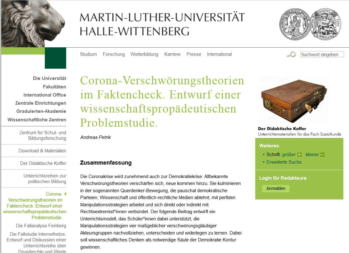 „Der Verschwörungsglaube erschüttert die Grundfesten unserer Demokratie. Im schlimmsten Fall führt dies nicht nur zur Politikverdrossenheit und Wissenschaftsfeindlichkeit, sondern zu Gewalt, wie wir beispielsweise bei den Querdenken-Demonstrationen sehen können“, sagt Prof. Petrik, der an der MLU Didaktik der Sozialkunde und politische Bildung lehrt. Schulen hätten die Aufgabe, Kinder und Jugendliche über Verschwörungstheorien und die rhetorisch-manipulativen Mittel, die zu ihrer Verbreitung genutzt werden, aufzuklären, so Petrik.