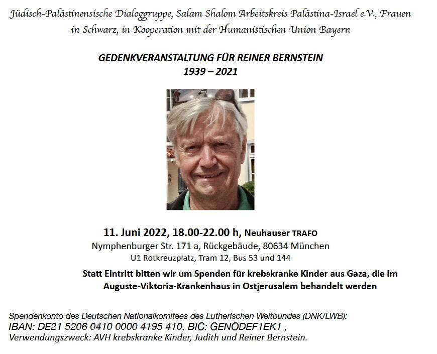 Aus dem Mailing des Jerusalemsvereins in Berlin – auch auf der Gedenkveranstaltung für Reiner Bernstein am heutigen 11. Juni in München wrd um Spenden für das Krankenhaus auf der Auguste Viktoria gesammelt, so wie sein letzter Wunsch war.