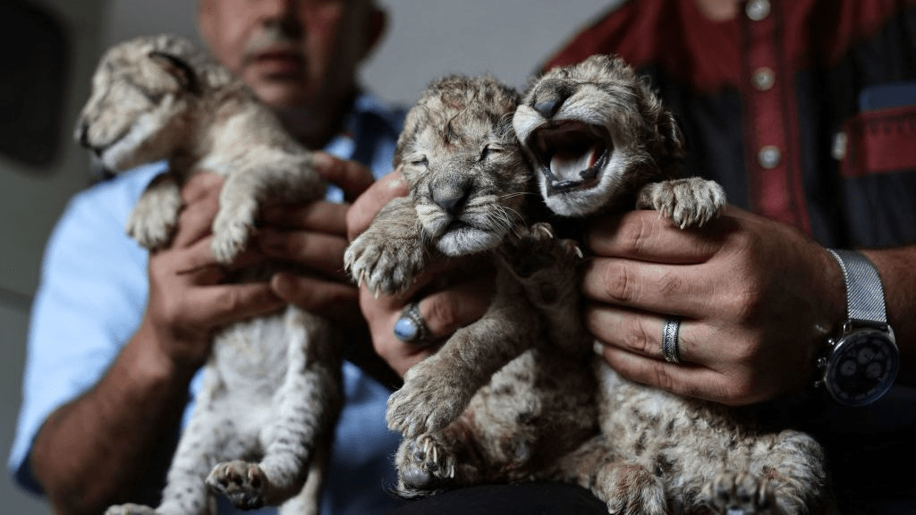 Newborn lion cubs were put on display at a zoo in Gaza City, a day after they were born to a mother lion who had in the past suffered miscarriages. Children who visited the small Nama Zoo on Saturday were permitted to pet the day-old cubs, which each weighed about 700 grams, or under two pounds. The zoo, which is home to birds, monkeys, deer, foxes, wolves and hyenas, is run by a private charity, allowing it to better care for its animals. Private zoos have had a harder time caring for its animals, leading some to starve to death and others to be killed by airstrikes in the coastal strip. Some large animals were evacuated by rescue organizations to animal sanctuaries in other countries.Employees present three newly born lion cubs at Nama Zoo in Gaza City, on August 12, 2022.