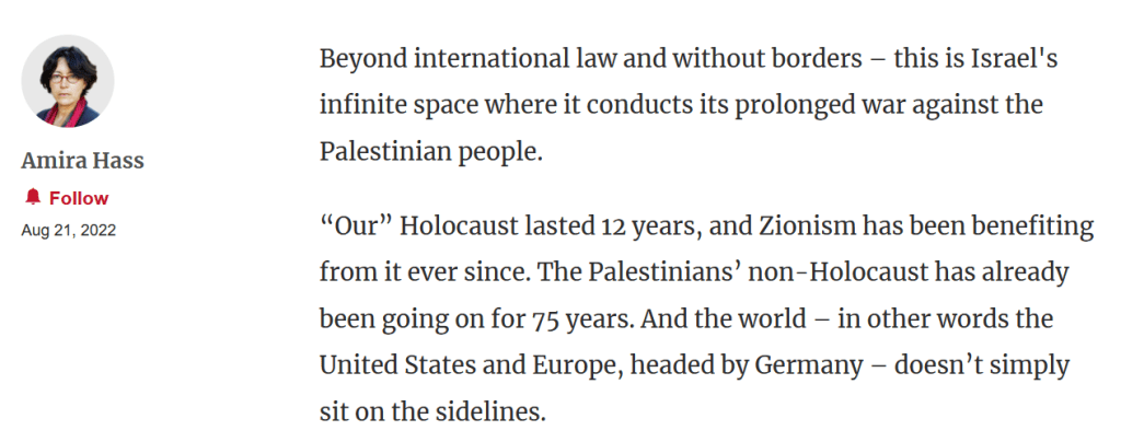 In ihrem Beitrag German Chancellor Olaf Scholz. What is really disgusting stellt die bekannte israelische Journalistin Amira Hass ihre Lesart des Abbas-Auftritts in Berlin dar. Sie spiegelt sie in ihrer Verzweiflung über die israelische Besatzungspolitikund deren Folgen. Dabei verweist sie besonders auf das Vorgehen der israelischen Regierung gegen die sechs palästinensischen Menschenrechts-NGOs. Deutschland, Europa und den Vereinigten Staaten wirft sie ihre Untätigkeit gegenüber diesem Unrecht vor.