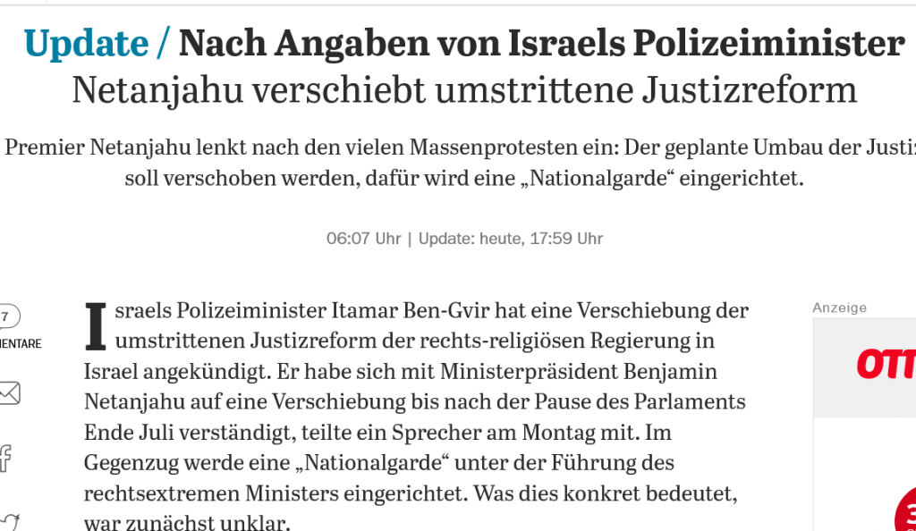 Verschoben ist nicht aufgehoben! Veröffentlicht am März 27, 2023Katgeorien Uncategorized Ein Land im Ausnahmezustand, aber ohne Blick auf eine „einigende“ Perspektive Entdecke mehr von Melde dich für ein Abonnement an, um die neuesten Beiträge per E-Mail zu erhalten. Gib deine E-Mail-Adresse ein ... Abonnieren Teilen mit: Klicken, um auf WhatsApp zu teilen (Wird in neuem Fenster geöffnet) WhatsApp Klick, um auf Pinterest zu teilen (Wird in neuem Fenster geöffnet) Pinterest Klicken, um auf Telegram zu teilen (Wird in neuem Fenster geöffnet) Telegram Klick, um auf Facebook zu teilen (Wird in neuem Fenster geöffnet) Facebook Gefällt mir Wird geladen …