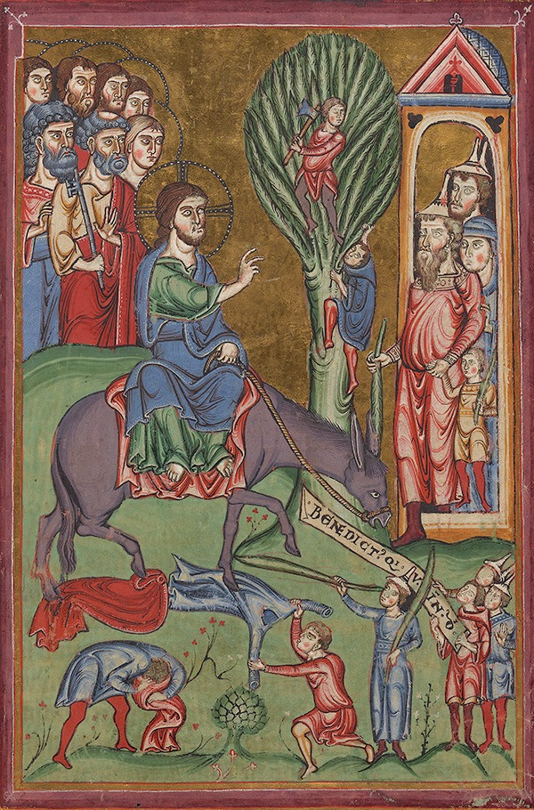Hier eine Miniatur den Einzugs Jesu in die Heilige Stadt aus dem Brandenburger Evangelistar, mehr dazu beim Faksimile-Verlag Quaternio (Luzern) (oder auf Facebook)