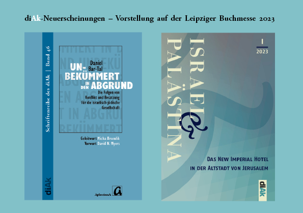 Nach Jahren ohne eine Messe in Leipzig wird der diAk auf der Leipziger Buchmesse in diesem Jahr ganz analog – auch nicht ’nur‘ analog – mit einem Stand in Kooperation mit unserem Verlag AphorismA, in dem die Zeitschrift israel & palästina erscheint und auch die Schriftenreihe, (Halle 2 Stand F 406) präsent sein – Herzlich willkommen zu einem Besuch!
