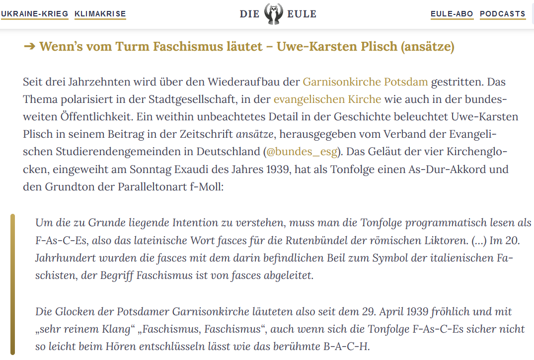 Hier der Screenshot, verwiesen wird auf die Zeitschrift Ansätze der ESG-Deutschland, der (noch?) nicht online verfügbar ist … entnommen dem Sonntags-Mailing vom online-Portal Die Eule, in der Selbstbeschreibung: „Nachrichten und Meinungen zu Kirche, Politik und Kultur, immer mit einem kritischen Blick aufgeschrieben für eine neue Generation„.
