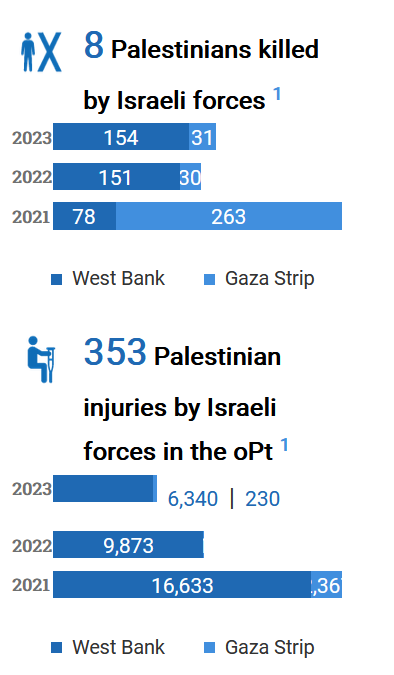 Regelmäßig faßt das Büro der Vereinten Nationen (OCHA, United Nations Office for the Coordination of Humanitarian Affairs, in the occupied Palestinian territory (oPt)) seine Erkenntnisse zusammen und bereitet sie auch graphisch auf:
