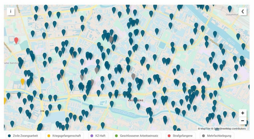 „Jede Markierung steht für ein ehemaliges Zwangsarbeiter-Lager im Berliner Stadtteil Kreuzberg. In der Datenbank können Nutzer nach bestimmten Straßen im heutigen Berlin suchen und sich nähere Informationen zu ehemaligen Lager-Standorten anzeigen lassen.“