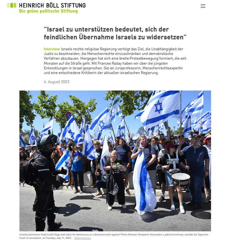 Ein Interview von Bauke Baumann, Referent der Heinrich-Böll-Stiftung für den Nahen Osten, mit Frances Raday, Professorin für Recht und Präsidentin des Concord Research Center for Integration of International Law in Israel an der Haim Striks School of Law.