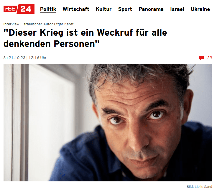 Etgar Keret ist einer der bekanntesten Autoren Israels und hat sich immer wieder für einen Frieden mit den Palästinensern ausgesprochen. Ein Gespräch über das, was der Krieg ihn gelehrt hat – und welche Art von Solidarität er sich nun wünscht. (rbb, 21. Oktober 2023)