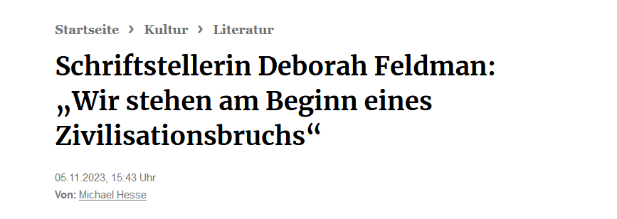 Am 2. November haben wir an dieser Stelle auf die Teilnahme der deutsch-US-amerikanischen Schriftstellerin Deborah Feldman in der Talkshow Lanz hingewiesen, die Frankfurter Rundschau bringt heute noch einmal ein längeres Interview mit ihr, das erneut auf die universalistische Lehre aus der Shoa und aus der (deutschen) Geschichte des 20. Jahrhunderts verweist.