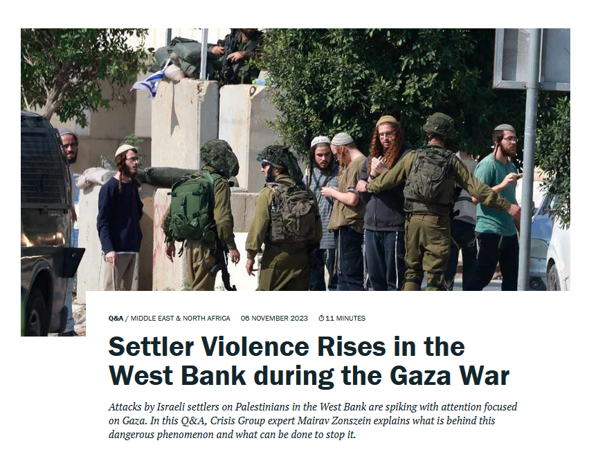 Aktuell bietet die Seite eine Einschätzung von Mairav Zonszein, Senior Analyst, Israel-Palestine, über die Gewalt der Siedler, die selbst den US-Präsidenten zu entsprechenden Interventionen veranlaßt hat und die doch sehr unter dem Radar der Ereignisse im Gazastreifen bleibt.