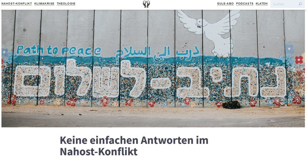 Die Ereignisse der letzten Wochen lassen auch hierzulande die Menschen nach Worten suchen, das Geschehene und das Geschehende zu „begreifen“ und einen Blick auf die Konsequenzen und das ‚zu Tuende‘ werfen. Pfr. Andreas Goetze, lange Jahre Landeskirchlicher Pfarrer für das interreligiöse Gespräch in Berlin (EKBO), jetzt tätig im Zentrum Ökumene EKHN/EKKW in Frankfurt/Main, hat das in einem Beitrag für das Portal Die Eule versucht, es gibt eben trotz allem keine einfachen Antworten in der komplexen Gemengelage des ‚Nahen Ostens‘ und unserer Beziehungen dorthin und dorther…