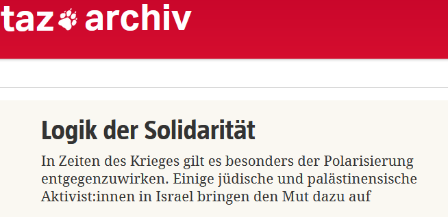 In der taz schreibt er über die Logik der Solidarität: In Zeiten des Krieges gilt es besonders der Polarisierung entgegenzuwirken. Einige jüdische und palästinensische Aktivist:innen in Israel bringen den Mut dazu auf. – Und ein anderes aktuelles Beispiel siehe weiter unten …