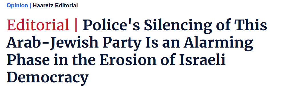 Das Editorial von Haaretz erinnert an die Fragilität der Demokratie auch in Israel und in der taz schreibt in einem Gastkommentar Prof. Elad Lapidot über „Protest und Kritik zu verbieten hilft niemandem, denn Juden und Palästinenser ziehen am selben Strang. Solidarität mit den Palästinensern ist notwendig“.