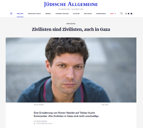 Die Jüdische Allgemeine hat dieser Tage allerdings einen Kommentar von Tobias Huch veröffentlicht, der für einige Irritationen gesorgt und auf den Ronen Steincke, rechtspolitischer Korrespondent bei der »Süddeutschen Zeitung«, geantwortet hat: