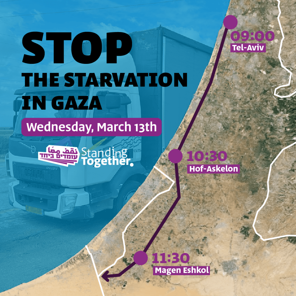 Today Standing Together will again lead a food and aid convoy to support the starving people of Gaza and the Israeli hostages who are held there. They will go to the border with Gaza with a food truck for and dozens of private cars, and will try to reach the Kerem Shalom passage.