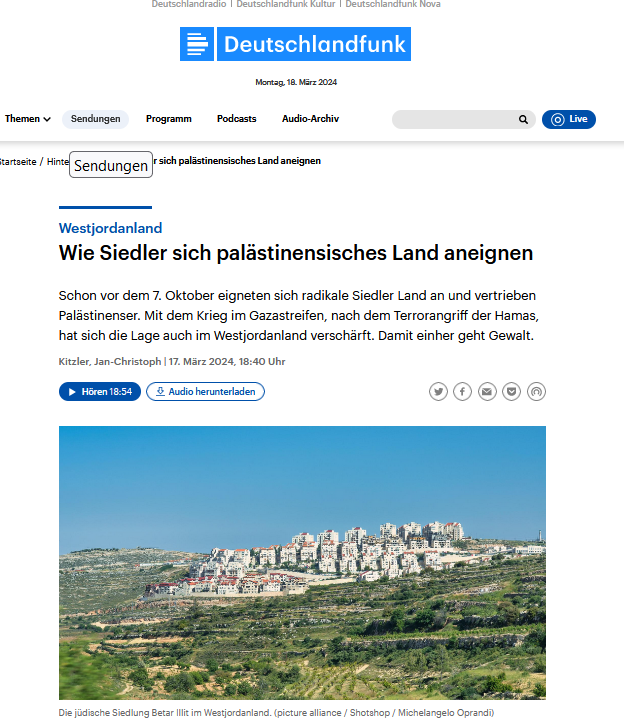 Die massiven Völkerrechtsverletzungen der israelischen Siedler gegen die palästinensische Bevölkerung im Westjordanland werden in den meisten deutschen Medien allenfalls am Rande erwähnt. Der Deutschlandfunk hat in einer Audio-Dokumentation zum Thema „Landgrabbing: Die Vertreibung von Palästinensern im Westjordanland“ dieses Vorgehen, das nach dem 7. Oktober stark zugenommen hat, anhand zahlreicher Beispiele dokumentiert.