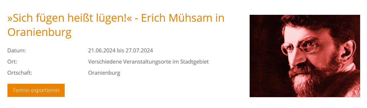 Ein Kreis von Menschen aus dem Kulturverein Alte Mosterei Eden e.V., dem Demokratieforum Oranienburg, dem Förderverein der Gedenkstätte und des Museums Sachsenhausen e.V. sowie der Erich Mühsam-Gesellschaft hat sich zum Ziel gesetzt, an den 90. Todestag von Erich Mühsam mit einem Veranstaltungsreigen zu erinnern.