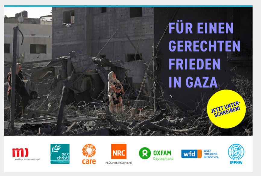 CARE, IPPNW, medico international, NRC Flüchtlingshilfe, Oxfam, pax christi und der Weltfriedensdienst haben auf der Plattform www.openpetition.de die Erklärung Für einen gerechten Frieden in Gaza. Waffenexporte stoppen & Hilfsblockade beenden! veröffentlicht: