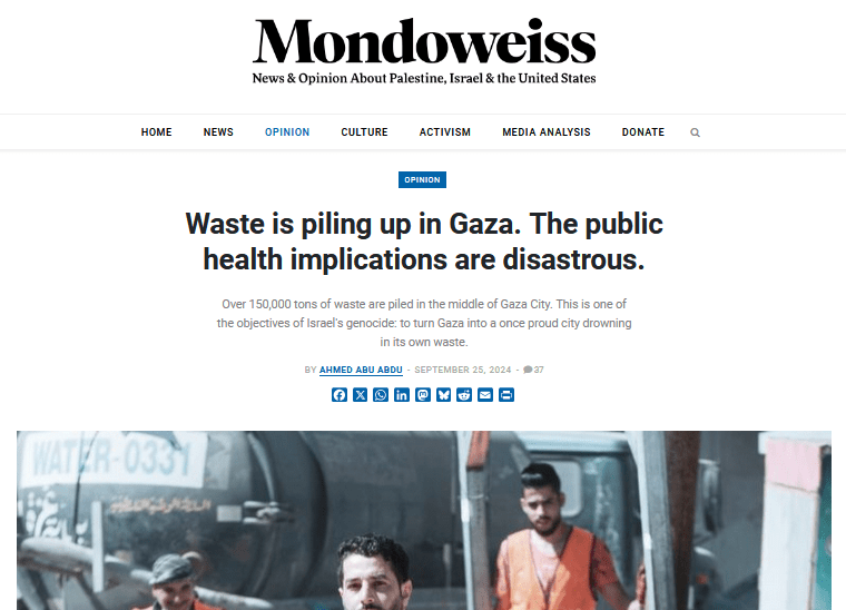 Ein Beitrag von Ahmed Abu Abdu aus Gaza auf Mondoweiss über die Situation der Müllentsorgung im Gazastreifen oder besser der nicht mehr funktionierenden Abfallentsorgung und all dem, was darauf folgt …