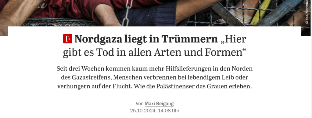 Mit Blick auf die Siedler-Konferenz in Israel am Montag (Siehe unseren Blogbeitrag vom 22. Oktober 2024) hier ein Beitrag von Maxi Beigang (sogar) im Tagesspigel: Nordgaza liegt in Trümmern: „Hier gibt es Tod in allen Arten und Formen“