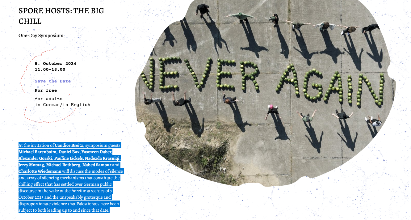 At the invitation of Candice Breitz, symposium guests Michael Barenboim, Daniel Bax, Yasmeen Daher, Alexander Gorski, Pauline Jäckels, Nadezda Krasniqi, Jerzy Montag, Michael Rothberg, Nahed Samour and Charlotte Wiedemann will discuss the modes of silence and array of silencing mechanisms that constitute the chilling effect that has settled over German public discourse in the wake of the horrific atrocities of 7 October 2023 and the unspeakably grotesque and disproportionate violence that Palestinians have been subject to both leading up to and since that date.