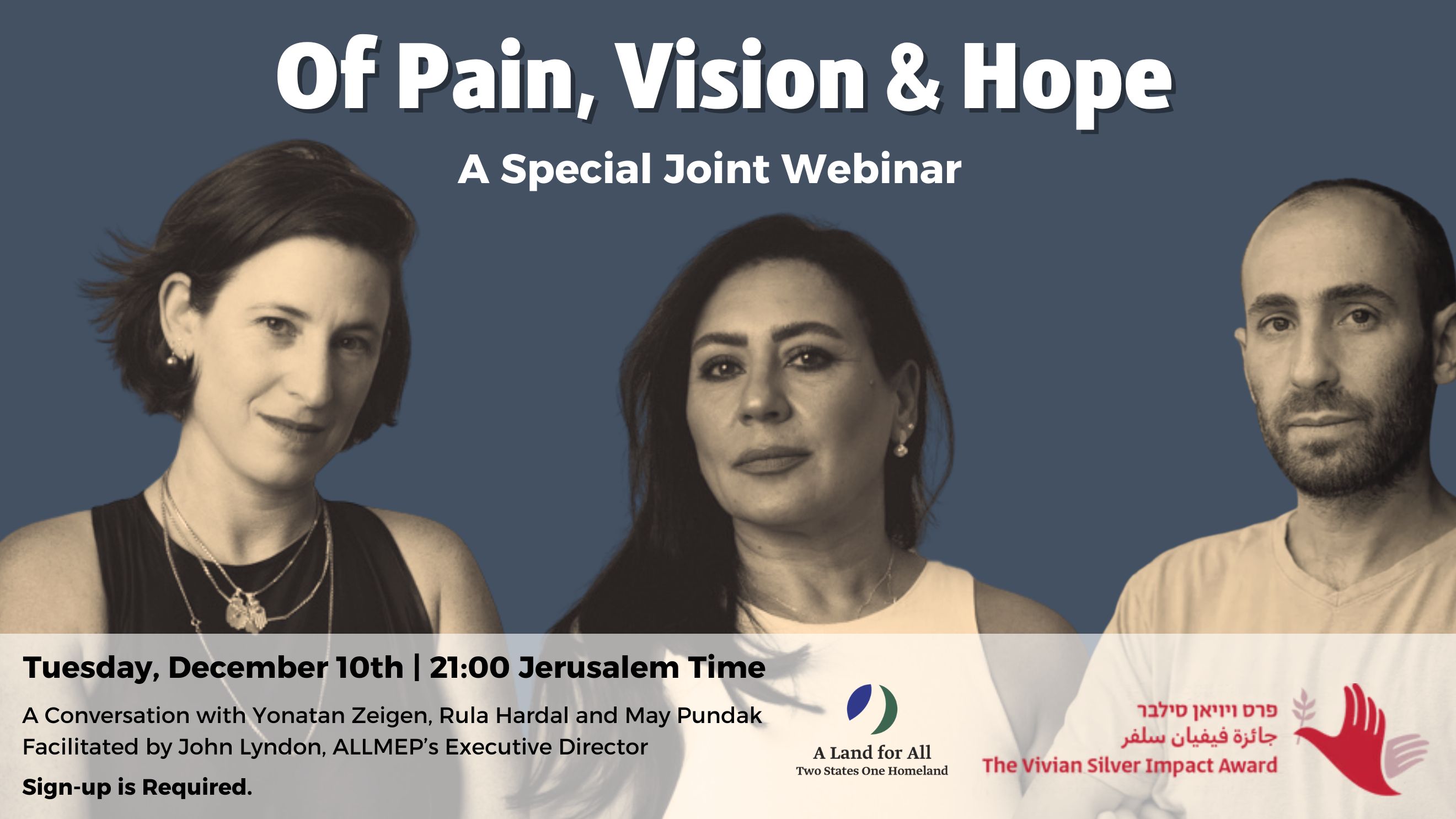 | We invite you to join us for a conversation featuring Yonatan Zeigen, peace activist, son of the late peace leader Vivian Silver, and founder of the Vivian Silver Impact Award, alongside this year’s newly announced award recipients: Dr. Rula Hardal and May Pundak, co-directors of A Land for All – Two States, One Homeland. This special event will be facilitated by John Lyndon, ALLMEP’s Executive Director. Together, they will reflect on their efforts to halt the ongoing catastrophe and their unwavering commitment to building a shared future between the river and the sea. This conversation will explore how we can all contribute to laying the foundations for peace and equality, carrying forward the torch of Vivian Silver’s legacy. Event Details: Date: Tuesday, December 10th Time: 9 PM Jerusalem Time (GMT+2) | 2 PM EST | 11 AM PST |