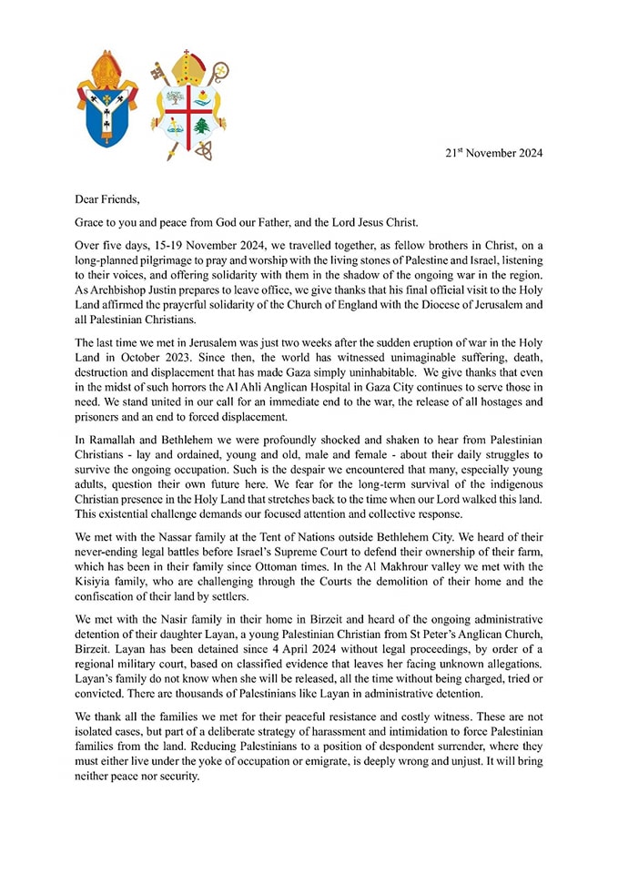 Over five days, 15-19 November 2024, we travelled together, as fellow brothers in Christ, on a long-planned pilgrimage to pray and worship with the living stones of Palestine and Israel, listening to their voices, and offering solidarity with them in the shadow of the ongoing war in the region. As Archbishop Justin prepares to leave office, we give thanks that his final official visit to the Holy Land affirmed the prayerful solidarity of the Church of England with the Diocese of Jerusalem and all Palestinian Christians.