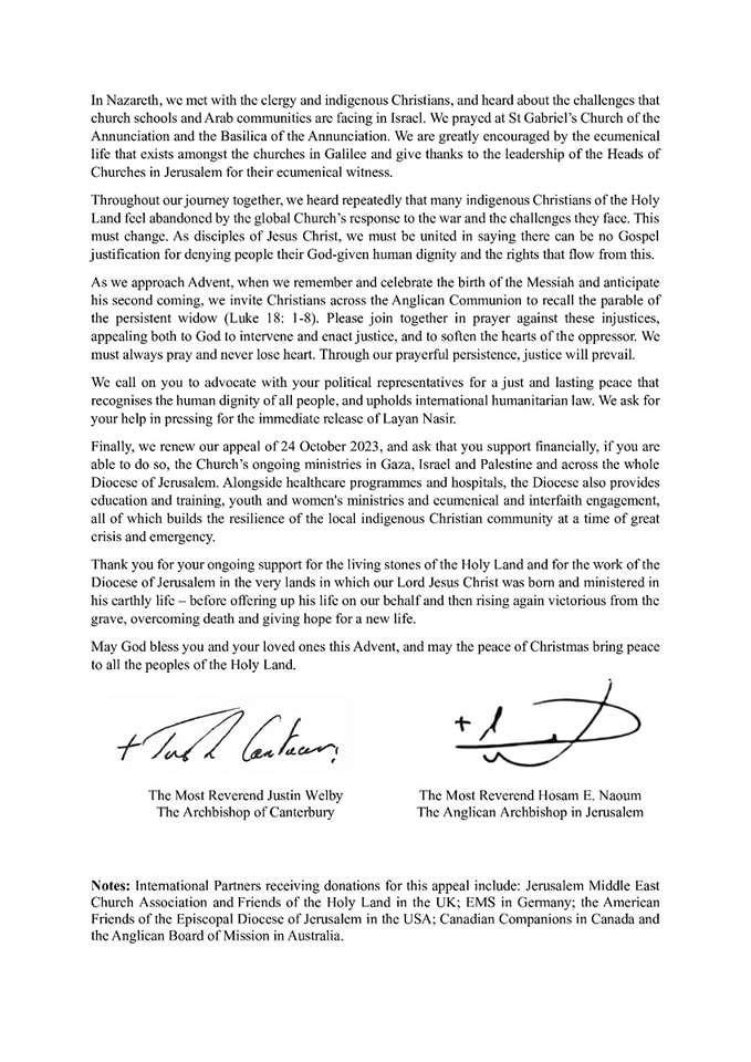 Finally, we renew our appeal of 24 October 2023, and ask that you support financially, if you are able to do so, the Church’s ongoing ministries in Gaza, Israel and Palestine and across the whole Diocese of Jerusalem. Alongside healthcare programmes and hospitals, the Diocese also provides education and training, youth and women’s ministries and ecumenical and interfaith engagement, all of which builds the resilience of the local indigenous Christian community at a time of great crisis and emergency.