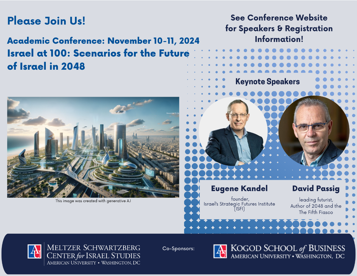 As Israel approaches its 100th anniversary in 2048, CIS and the Kogod School of Business invite you to explore the future as modern futurists, utilizing contemporary foresight approaches. Please join us as we convene scholars, economists, politicians, and activists at the country’s most difficult hour, to explore potential future scenarios for the Jewish state.