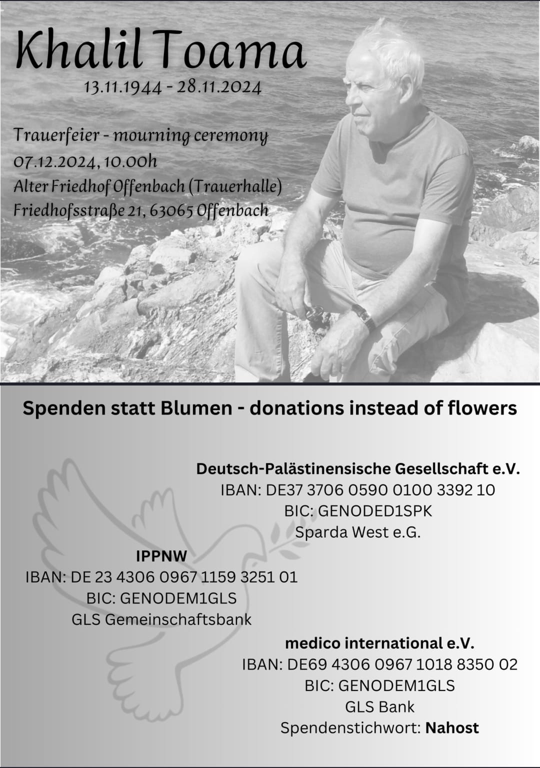 Khalil Toama (1944-2024) Veröffentlicht am Dezember 6, 2024Dezember 5, 2024Katgeorien Erinnerungsarbeit, Faschismus / Antifaschismus, Friedens- und Versöhnungsarbeit, Israel und Palästina, Kultur, Portrait Entdecke mehr von Melde dich für ein Abonnement an, um die neuesten Beiträge per E-Mail zu erhalten. Gib deine E-Mail-Adresse ein ... Abonnieren Teilen mit: Klicken, um auf WhatsApp zu teilen (Wird in neuem Fenster geöffnet) WhatsApp Klick, um auf Pinterest zu teilen (Wird in neuem Fenster geöffnet) Pinterest Klicken, um auf Telegram zu teilen (Wird in neuem Fenster geöffnet) Telegram Klick, um auf Facebook zu teilen (Wird in neuem Fenster geöffnet) Facebook Gefällt mir Wird geladen …