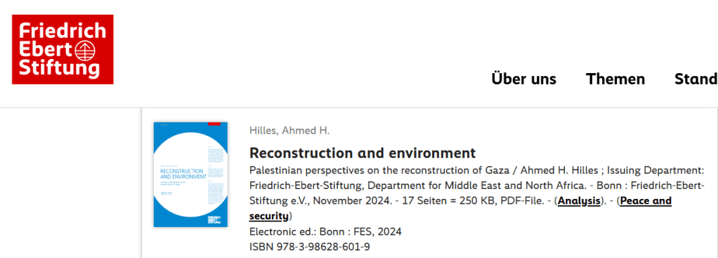 Palästinensische Perspektiven – Im Rahmen des gemeinsamen Projekts „Palästinensische Perspektiven auf den Wiederaufbau von Gaza“ veröffentlichten die Friedrich-Ebert-Stiftung (FES) und die Stiftung Wissenschaft und Politik (SWP) umfassende Analysen zur Wiederaufbau- und Zukunftsplanung des Gazastreifens.