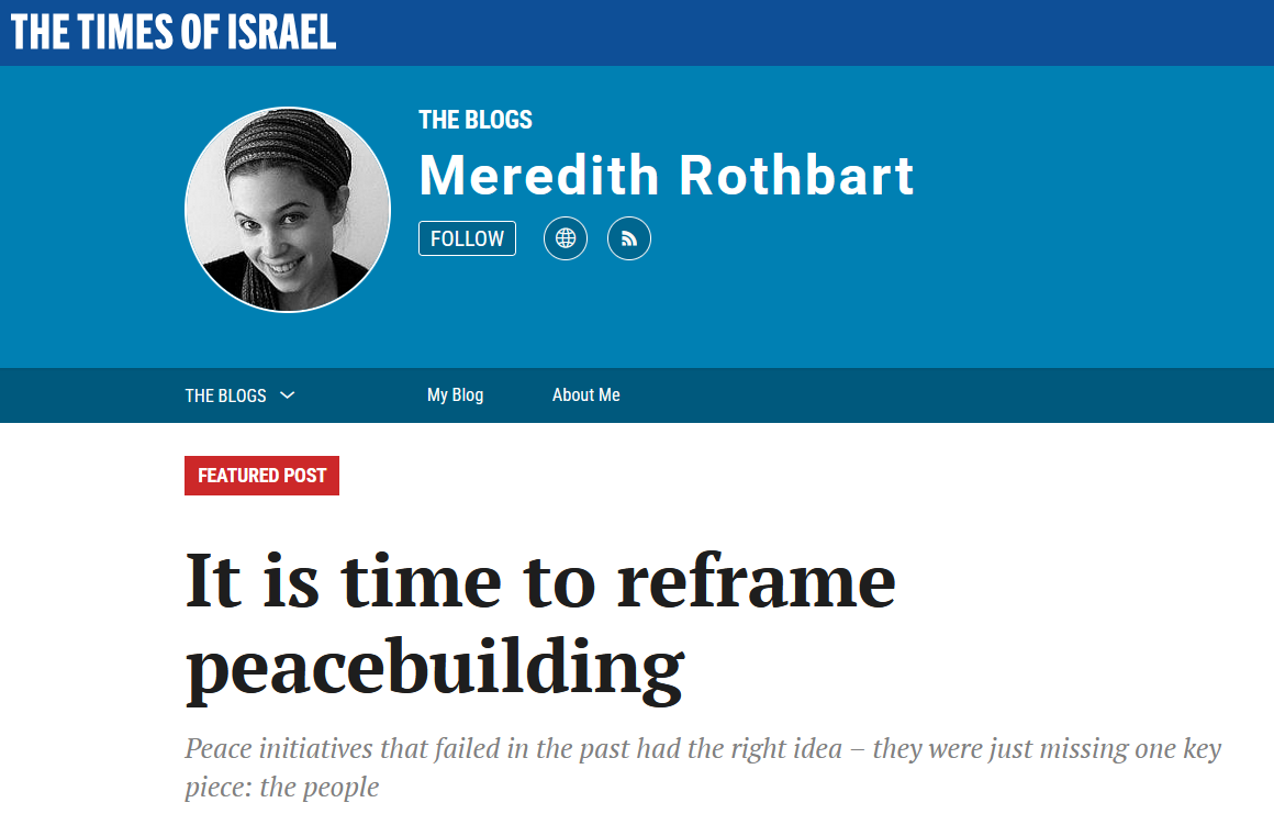 Unter der Rubrik The Blog der Times of Israel (ToI) reflektiert Meredith Rothbart, (co-founder and CEO of Amal-Tikva, a Jerusalem-based organization creating the infrastructure needed for peacebuilding to become a professional field capable of achieving lasting, scalable social change within and across Israeli and Palestinian societies) über die Perspektiven der Friedensarbeit.