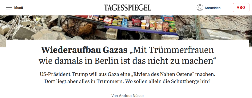 Aufbau erhoffend, auch wenn … Veröffentlicht am Februar 8, 2025Katgeorien Annektion, Annexion, Besatzung, Gaza, Israel und Palästina, Menschenrechte, Naher Osten … die Chancen dafür noch nicht wirklich gut sind: Ein Bericht im Berliner Tagesspiegel: Und ein Beitrag aus dem britischen Guardian: Entdecke mehr von Melde dich für ein Abonnement an, um die neuesten Beiträge per E-Mail zu erhalten. Gib deine E-Mail-Adresse ein ... Abonnieren Teilen mit: Klicken, um auf WhatsApp zu teilen (Wird in neuem Fenster geöffnet) WhatsApp Klick, um auf Pinterest zu teilen (Wird in neuem Fenster geöffnet) Pinterest Klicken, um auf Telegram zu teilen (Wird in neuem Fenster geöffnet) Telegram Klick, um auf Facebook zu teilen (Wird in neuem Fenster geöffnet) Facebook Gefällt mir Wird geladen …