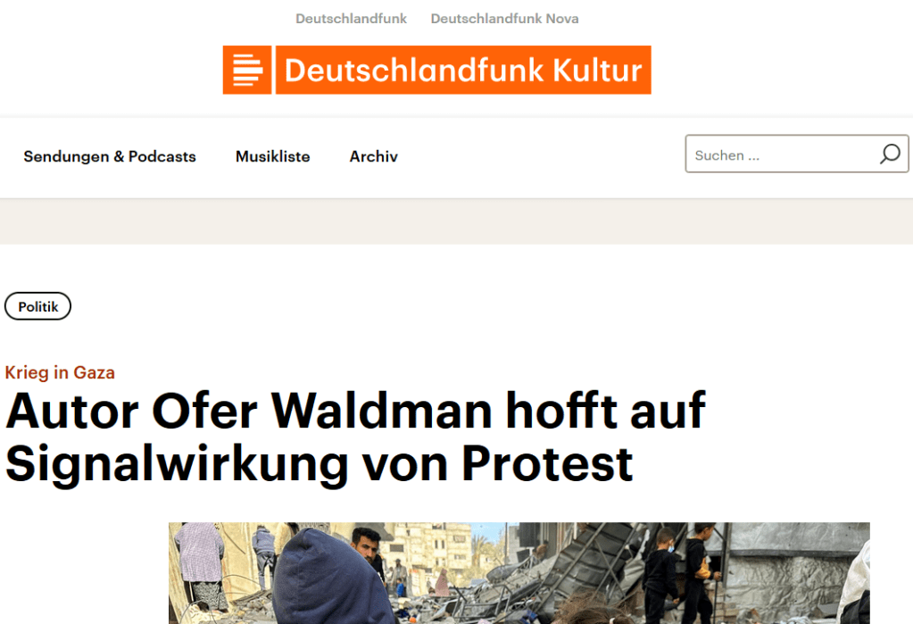 Interview bei Deutschlandfunk Kultur: Autor Ofer Waldman hofft auf Signalwirkung von Protest | Mehr dazu: Wenig Wirkung vor Ort