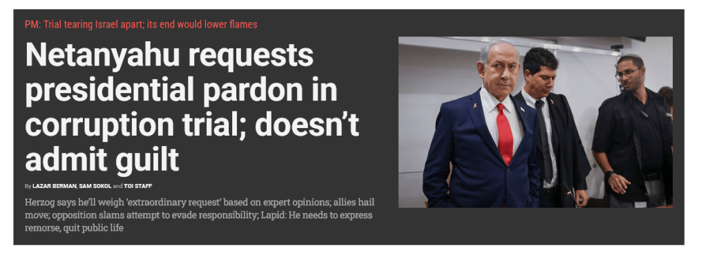 Wie kann man (~frau) um Begnadigung ersuchen, wenn keine Schuld vorliegt? Hier der Bericht der Times of Israel über die neue Pirouette des Ministerpräsidenten…