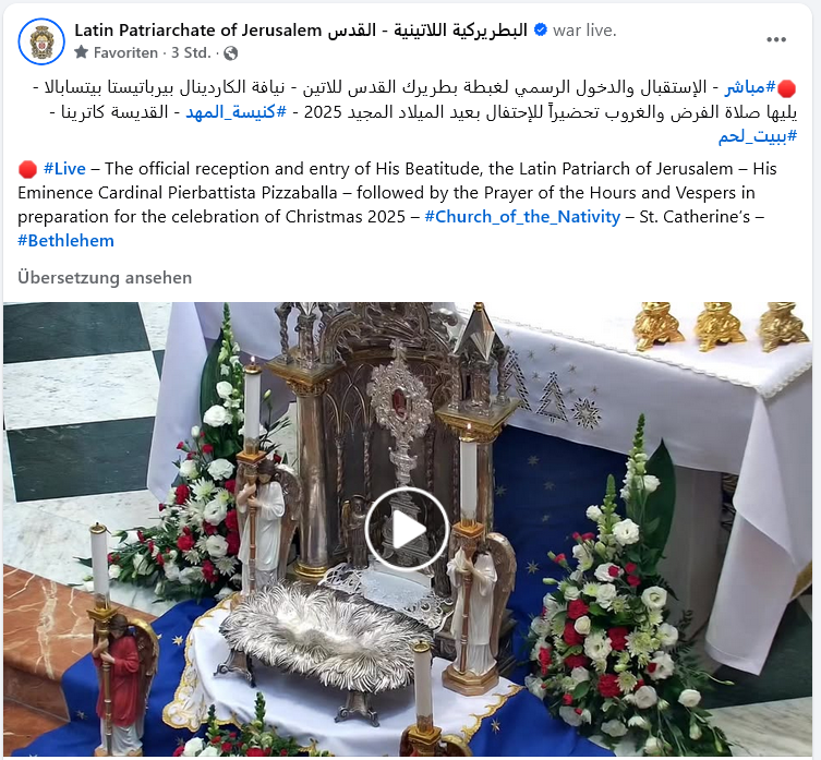 Einzug in Bethlehem … Veröffentlicht am Dezember 24, 2025Katgeorien Heiliges Land, Religion, Uncategorized https://fb.watch/EbLzayoaCH/ Entdecke mehr von Melde dich für ein Abonnement an, um die neuesten Beiträge per E-Mail zu erhalten. Gib deine E-Mail-Adresse ein ... Abonnieren Teilen mit: Klicken, um auf WhatsApp zu teilen (Wird in neuem Fenster geöffnet) WhatsApp Klick, um auf Pinterest zu teilen (Wird in neuem Fenster geöffnet) Pinterest Klicken, um auf Telegram zu teilen (Wird in neuem Fenster geöffnet) Telegram Klick, um auf Facebook zu teilen (Wird in neuem Fenster geöffnet) Facebook Gefällt mir Wird geladen …
