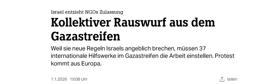 Nach zahlreichen Regierungen und Organisationen hat auch VN-Generalsekretär António Guterres das von Israel verhängte Arbeitsverbot für internationale Hilfsorganisationen kritisiert. In einer Erklärung am Freitagabend verlangte Guterres die Rücknahme der Maßnahme. Nichtregierungsorganisationen seien für lebensrettende Arbeit in den Palästinensergebieten unverzichtbar. Er verwies auf Israels völkerrechtliche Verpflichtung, humanitäre Hilfe zu ermöglichen. (Bericht Radio Vatikan)