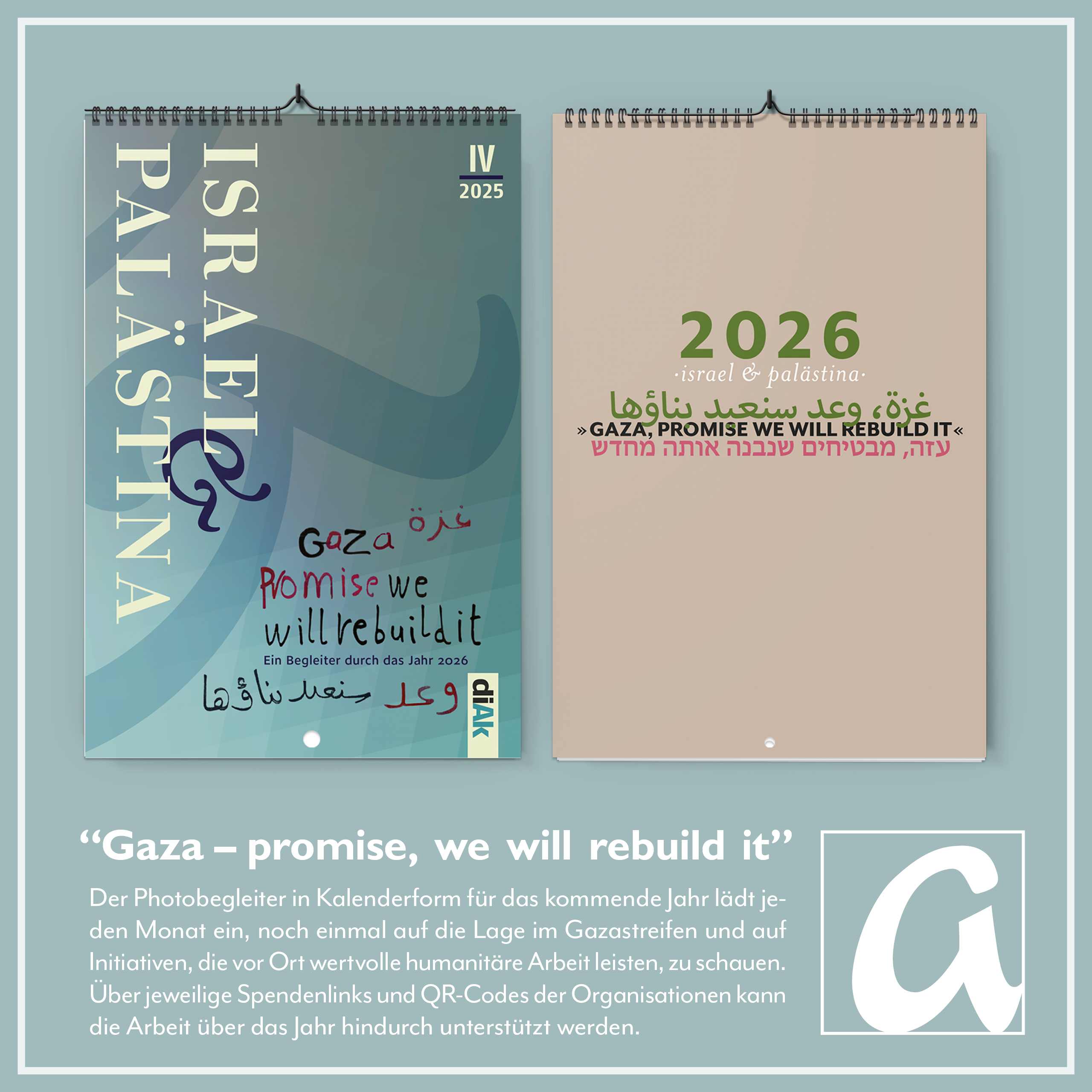 Der 11. Kalender im Rahmen von israel & palästina | Zeitschrift für Dialog! Dieser Kalender geht in den Druck zu einem Zeitpunkt, an dem es einen fragilen Waffenstillstand im Gazastreifen gibt, von dem niemand weiß, ob er auch 2026