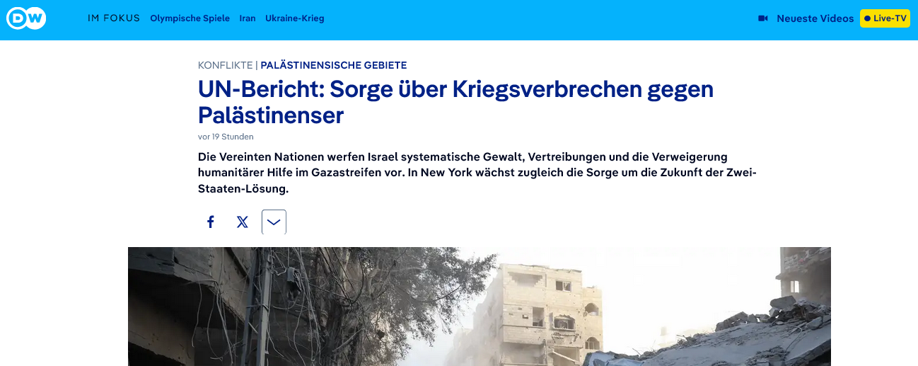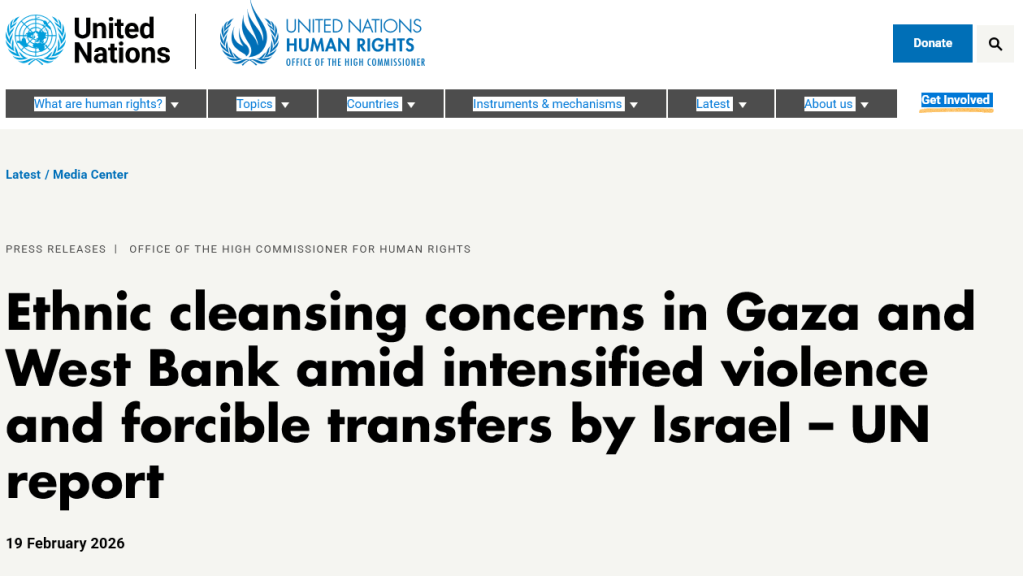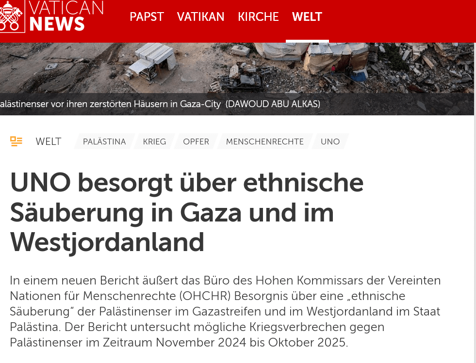 Ethnische Säuberung? Veröffentlicht am Februar 23, 2026Katgeorien Annektion, Annexion, Besatzung, Gaza, Israel und Palästina, Menschenrechte, Vereinte Nationen Wenige Begriffe spalten so sehr in der Debatte um Isarel / Palästina – Palästina/Israel: Hier drei aktuelle Berichte zu Situation: Vereinten Nationen (OCHR) Radio Vatikan: Deutsche Welle Entdecke mehr von Melde dich für ein Abonnement an, um die neuesten Beiträge per E-Mail zu erhalten. Gib deine E-Mail-Adresse ein ... Abonnieren Teilen mit: Auf WhatsApp teilen (Wird in neuem Fenster geöffnet) WhatsApp Auf Pinterest teilen (Wird in neuem Fenster geöffnet) Pinterest Auf Telegram teilen (Wird in neuem Fenster geöffnet) Telegram Auf Facebook teilen (Wird in neuem Fenster geöffnet) Facebook Gefällt mir Wird geladen …