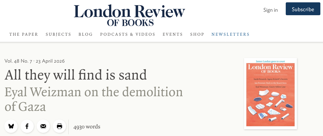 Hier ein Zitat aus der aktuellen Ausgabe der London Review of Books / April 2026