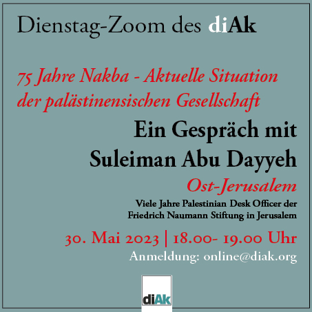 Nach halbjähriger Pause soll unsere Zoom-Gesprächsreihe nun endlich weitergehen. Jeden ersten Dienstag im Monat laden wir einen spannenden Gast aus Deutschland, Israel oder Palästina ein, um mit neuen Perspektiven auf die Region zu blicken und die aktuelle Lage vor Ort zu diskutieren. Dabei ist es uns stets ein Anliegen, eine Vielfalt von Stimmen zu Wort kommen zu lassen, die sich (im Einklang mit den Leitsätzen des diAK) für einen offenen und sachlichen Diskurs sowie für einen dauerhaften und gerechten Frieden in Israel und Palästina einsetzen.