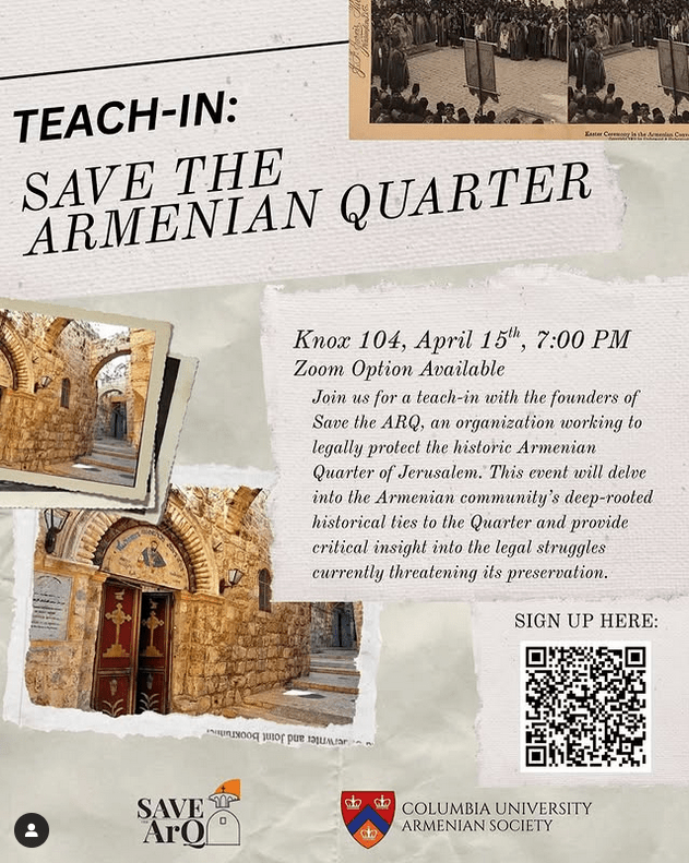 On April 15th at 7:00 PM EST (leider für uns in Mitteleuropa 1.00 morgens), join for a (Zoom) teach-in with the founders of Save the ARQ, an organization working to legally protect the historic Armenian Quarter of Jerusalem. Link to register online or in-person!