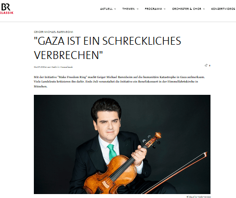 Mit der Initiative „Make Freedom Ring“ macht Geiger Michael Barenboim auf die humanitäre Katastrophe in Gaza aufmerksam. Viele Landsleute kritisieren ihn dafür. Ende Juli veranstaltet die Initiative ein Benefizkonzert in der Himmelfahrtskirche in München – Ein Beitrag (Kathrin Hasselbeck) auf br-klassik.de