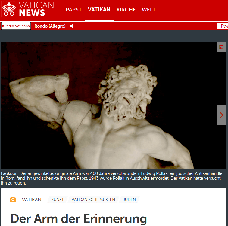 Ludwig Pollak, geboren 1868 in Prag, ein international bekannter, lange in Rom lebender jüdischer Antiquar, Kunsthändler und Archäologe, fand den fehlenden Arm des Laokoon – Im Oktober 1943 wurden er uns seine Familie in Auschwitz ermordet.